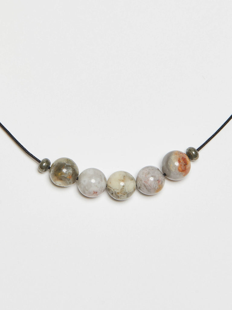 The Mini Agate Beaded Necklace has 5 Agate beads on a thin black string knotted to be adjustable. Pyrite beads on each end. Agates are primarily formed within volcanic and metamorphic rocks. All stones are unique and different, they will vary in color and may not be as pictured.